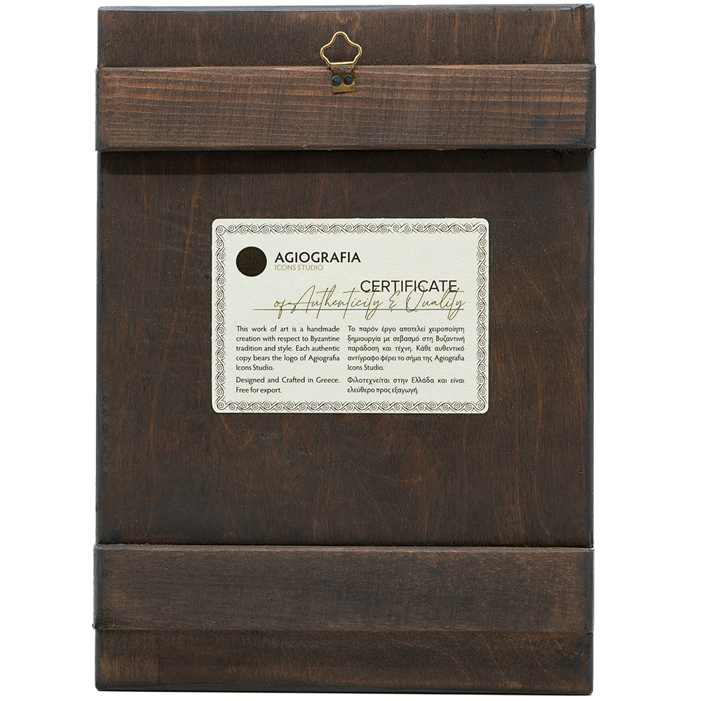 This is a 100% Handwritten artwork crafted according to Byzantine technique and style, totally painted by hand with 24 karats Gold Leaves background. Once the theme is painted by our skilled craftsmen, a mounting point and the Certificate of Authenticity and Quality are installed at the back of the icon.