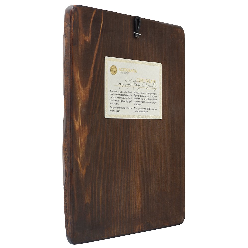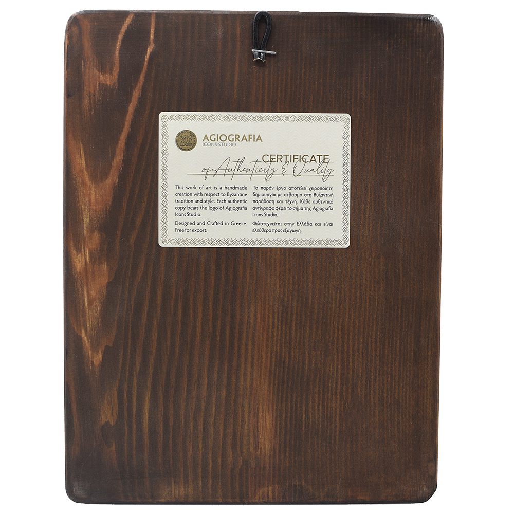 This icon is a 100% handwritten work of art. It is made of Carved wood and the background is handcrafted with Gold Leaves. It is delivered properly and securely packaged. Every icon is crafted after your order and you will receive the courier tracking number once it is ready to ship.
